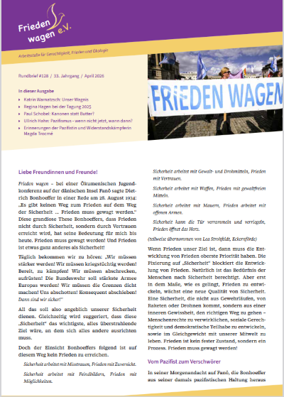 Der bisherige Lebenshaus-Rundbrief wird entsprechend dem geänderten Vereinsname nun mit dem Namen "Frieden wagen" fortgesetzt. Michael Schmid stellt an den Beginn des Einleitungsartikels, in dem er sich mit "Frieden wagen" und der heutigen Bedeutung dieser Aussage befasst, zunächst die grandiose These von Dietrich Bonhoeffer. Dieser hatte in einer Rede am 28. August 1934 gesagt: "Es gibt keinen Weg zum Frieden auf dem Weg der Sicherheit … Frieden muss gewagt werden." In den "Nachrichten" wird u.a. zur Teilnahme an den diesjährigen Ostermärschen aufgerufen, und es wird zur 14. "We shall overcome!"-Tagung am 17. Oktober mit Jacqueline Andres und Bruno Kern eingeladen. Katrin Warnatzsch schreibt über "Unser Wagnis". Axel Pfaff-Schneider berichtet ausführlich über den Vortrag von Regina Hagen, den diese bei der Tagung "We shall overcome!" im November 2025 hielt. Paul Schobel nimmt in seiner Rede bei einer Friedenskundgebung mit dem Titel "KANONEN STATT BUTTER? - Die Militarisierung bedroht den Sozialstaat" einmal mehr kein Blatt vor den Mund. Ullrich Hahn geht in 14 Thesen auf die Frage "Pazifismus — wenn nicht jetzt, wann dann?" ein. Hingewiesen wird auf 2 Bände mit den "Erinnerungen der Pazifistin und Widerstandskämpferin Magda Trocmé", die gerade von unserem Fördermitglied Gottfried Orth aus dem Französischen übersetzt & neu herausgegeben wurden. (mehr...)