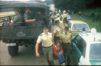 Schon am ersten Abend rückte ein großes Polizeiaufgebot zur Räumung an. Die Polizisten kamen ohne Knüppel, Helm und Schild. Sie schienen sich auf die Gewaltfreiheit der blockierenden Menschen zu verlassen. Gegen 21 Uhr erhob der Einsatzleiter drei Mal ultimativ die Forderung, die Zufahrt für einen Transport der Bundeswehr freizumachen. Weil sich niemand erhob, kam der Befehl zur Räumung. Jede und jeder Einzelne wurde weggetragen. Mit einem Bus wurden die Weggetragenen ein Stück weit abtransportiert. Ihre Personalien wurden aufgenommen und für die spätere Anklage wurde ein Foto gemacht. Dann wurden die blockierenden Menschen wieder freigelassen. Auf der Zufahrtsstraße saßen jedoch bereits die nächsten Gruppen. Die Blockade ging weiter wie angekündigt.
