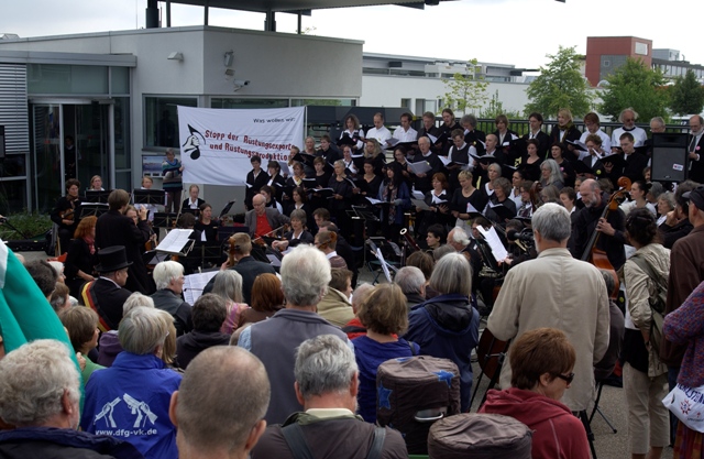 “Waffenhandwerk schafft nur Unheil” (G.F. Händel) - Großes Klassik-Konzert gegen Waffenproduktion bei Heckler&KochEin ungewöhnliches Konzert an einem ungewöhnlichen Ort konnten die Angestellten von Heckler&Koch, Polizei und Werkschutz sowie 300 Friedensaktivistinnen und -aktivisten aus Baden-Württemberg am 3. September 2012 um 10:00 Uhr vor dem Haupttor der Kleinwaffenfabrik Heckler&Koch erleben. Die Konzert-Aktion "Waffenhandwerk schafft nur Unheil" war als Kontrapunkt gegen die Normalität der Waffenproduktion und der Waffenexporte konzipiert worden. Und so war es auch im wahrsten Sinne des Wortes: Über den Werkshallen erklangen wohl zum ersten mal klassische Stücke mit friedenspolitischen und antimilitaristischen Texten von Wolfgang Pasquay (Friedensoratorium), Leoš Janácek (Ach Krieg), Uli Klan (Wer die Wahrheit spricht) sowie Händels Arie "Waffenhandwerk schafft nur Unheil" aus dem Alexanderfest. Das Orchester spielte Werke von Schubert (Unvollendete) und Schostakowitsch.
